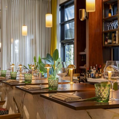 A palette of tactile textures and continuous surfaces reinforces the restaurant’s architectural cohesion, allowing each element to flow effortlessly into the next. Material combinations such as natural wood, metal framing, textured textiles, and thoughtfully placed pendant lighting introduce layers of visual depth, while custom millwork reinforces the continuity found throughout the hotel. Select greenery and curated tabletop objects enhance the spatial balance, ensuring every element supports the overall rhythm of the room.