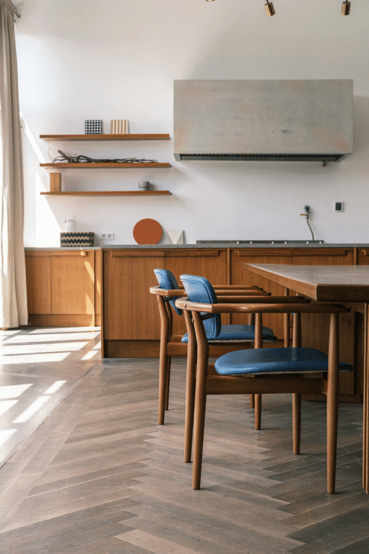 In practice, if we place an Eames chair leather and wood in a room with a very robust handmade table and a rug with a triangle pattern, we have the mid-century modern style applied.